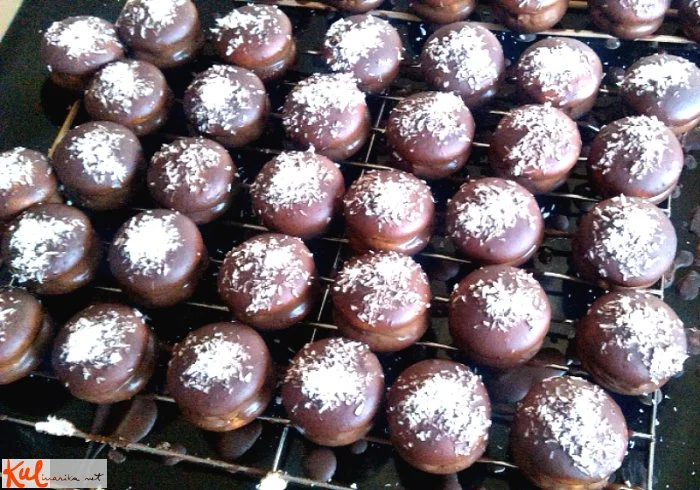 Potresemo s kokosovo moko in odložimo, najbolje čez noč, na hladno, da se okusi prepojijo in biskvitki zmehčajo.