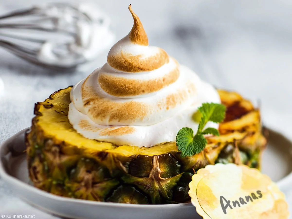 2. Ananas z izdolbeno stranjo navzdol v približno 3 minutah popečemo na žaru, nato ga postavimo na hladno. Beljake čvrsto stepemo ter pri tem postopoma dodajamo sladkor in vanilijev sladkor. Stepamo, dokler ne nastane svetleča, zelo čvrsta masa. Vdolbine na kolobarjih ananasa napolnimo z izdolbenim ananasovim mesom in sladoledom ter prekrijemo s snegom iz beljakov. Takoj postavimo na žar, zapremo pokrov in pečemo, dokler sneg lepo ne porjavi.