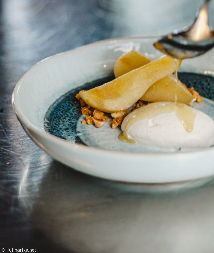 Hruška kuhana v pivu z mandljevim drobljencem