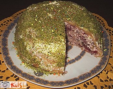 v večjo posodo stresemo skuto, dodamo sladkor, majhne koščke ali ostružke čokolade, narezane mandlje in pistacije. Dodamo še višnje. Če je masa preveč suha, lahko dodamo malo kisle smetane. Posodo obložimo z oprijemljivo folijo, nato obložimo z biskvitom. Napolnimo z nadevom in pokrijemo z oprijemljivo folijo. Sladico damo v skrinjo vsaj za 2 uri. Nato je sladica pripravljena za postrežbo. Dober tek!