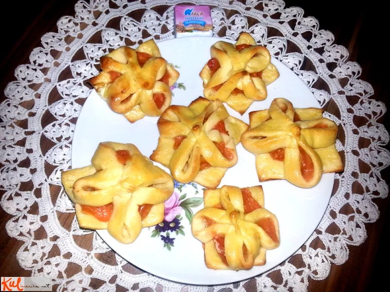 Vzhajano testo stresemo na pult, pregnetemo in pustimo nekaj minut, da se spočije. Potem ga razvaljamo in razrežemo na kvadrate, ki jih ob straneh na vsakem vogalu še enkrat zarežemo, kot je razvidno s slike. Nato na sredino vsakega kvadrata položimo žličko nadeva in zunanji del vogalov stisnemo na sredini skupaj preko nadeva, kot prikazuje slika. Vsako nastalo rožico položimo na pekač in jo premažemo s stepenim jajcem. Rožice ustimo še nekaj minut vzhajati, nato pekač prestavimo v vročo pečico in pečemo približno 20 minut pri 200 stopinjah, da se lepo obarvajo.