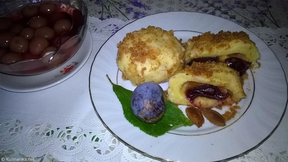 4. Pri oblikovanju cmokov si pomagamo tako, da roke sproti pomakamo v mrzlo vodo in od testa trgamo želeno količino, jo sploščimo, v sredino položimo slivo, vanjo nasujemo sladko mešanico in dobro obdelamo - oblikujemo v cmok (biti morate natančni, da cmok dobro zaprete).