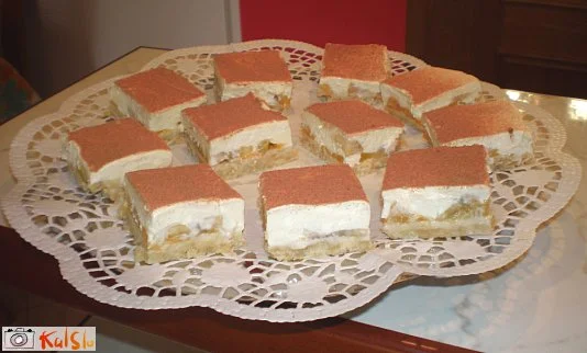 breskve iz kompota narežemo in jih položimo na kekse. Nato narežemo še banane na kolesca in jih prav tako položimo na podlago.