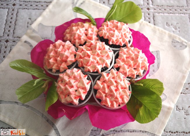 * Za kremo sem naredila pariško kremo iz 100 g stopljene bele čokolade, ki sem jo vmešala v obarvano stepeno sladko smetano (250 ml). Kreme je dovolj za 20 kolačkov. Za kremo brez grudic naj bodo sestavine podobnih temperatur, kar pomeni malo ohlajena bela čokolada, in smetana, ki stepena stoji na sobni temperaturi kakšne pol ure ali eno uro.