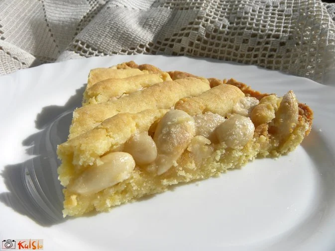 Testo razvaljamo na centimeter debelo in ga položimo v tortni model, na vrh damo naribano jabolko in mandlje.