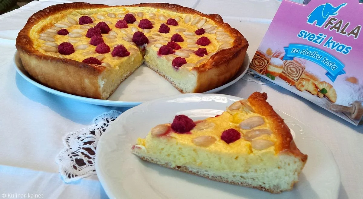 Vzhajano testo stresemo na pult, ga pregnetemo in pustimo počivati nekaj minut, nato ga razvaljamo in položimo na pekač. Ob robovih povlečemo testo po stranici pekača navzgor in notranjost pogače napolnimo z vanilijevo kremo. Po vrhu jo okrasimo s polovičkami mandljev, tik preden je pečena, dodamo še maline, ki jih posujemo z vanilijevim sladkorjem. Pogačo pečemo približno 50 minut pri 180 stopinjah.