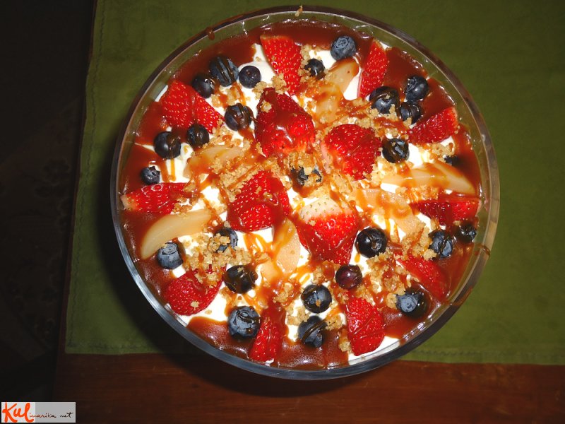 Ko se moussi malo strdijo, jih damo v dresirne vrečke in pričnemo zlagati zloženko. Na dno najprej damo sadje, ga posujemo z drobtinami in pokapamo s karamelo. Nato sledi plast moussa. Postopek ponavljamo, dokler ne porabimo vsega.