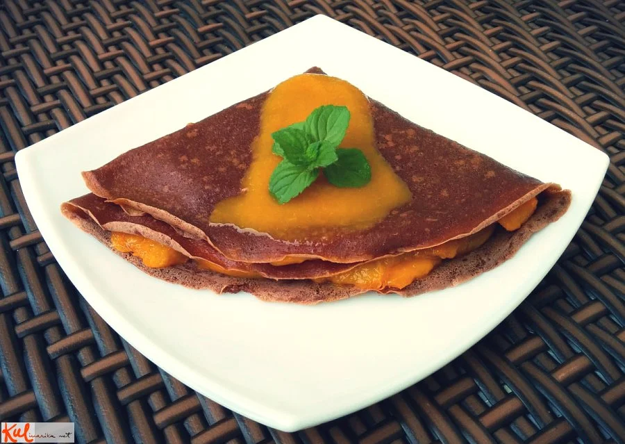 2. Breskve olupimo, razkoščičimo in narežemo na tanke krhlje. Lotimo se peke palačink. Malo moramo biti pozornejši, ker je testo za palačinke že kot testo temno, da jih ne zažgemo.