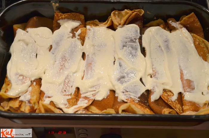 Smetano in sladkor zmešamo skupaj in na koncu po vrhu pomažemo vse palačinke ter jih damo peči v predhodno ogreto pečico na 160 stopinj za 20 minut.