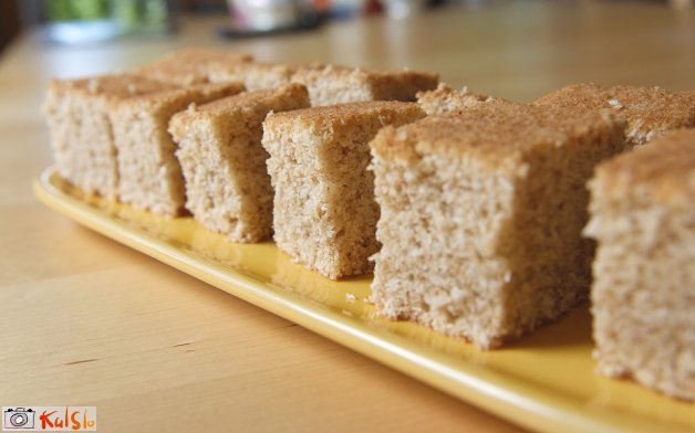 Spekla včeraj. Delala sem iz rjavega sladkorja in polbele moke. Kokosove moke sem imela doma kakšno pest premalo, zato sem dodala še pest mletih orehov. Pecivo se je lepo dvignilo in ni bilo niti najmanj vodeno. Bilo je zelo rahlo. Ni se mi zdelo niti suho, ampak bom prihodnjič mogoče vseeno dodala še kakšno naribano jabolko. Bom recept sigurno še uporabila tudi takrat, ko mi ne bo treba peči brez jajc.