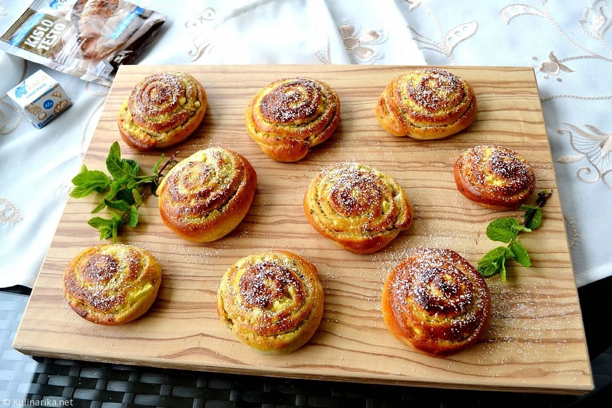 Tega razrežemo na rezine in jih zložimo na pekač, prekrit s peki papirjem. Pustimo jih vzhajati na toplem, nato pa premažemo s stepenim jajcem in prestavimo v vročo pečico.