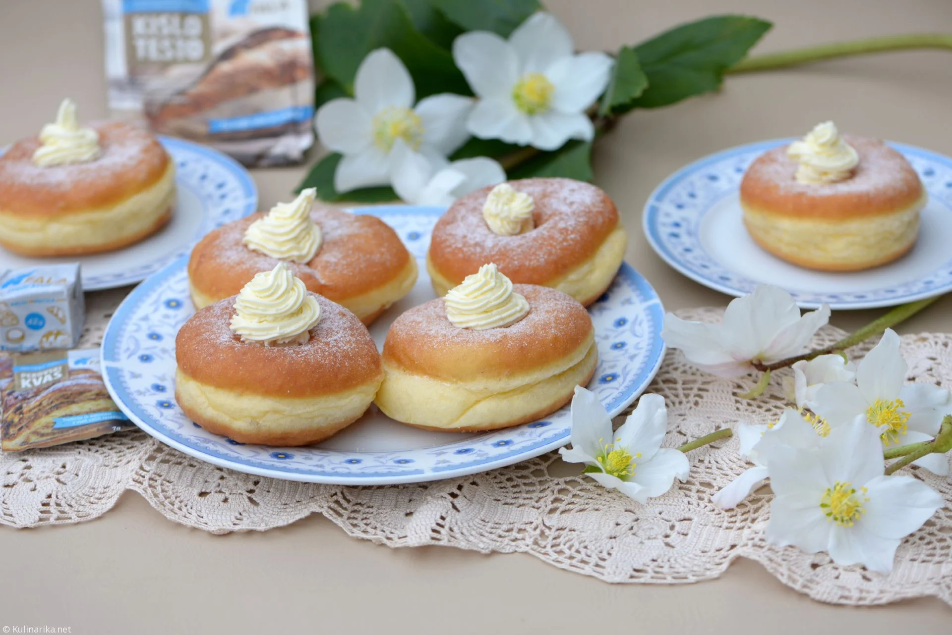 3. Vzhajano testo stresemo na pult, ga pregnetemo, pustimo nekaj minut počivati, nato pa razvaljamo na dober prst debelo. Izrežemo krofe z luknjo na sredini, jih zložimo na rahlo pomokano krpo, jih pokrijemo in pustimo drugič vzhajati.