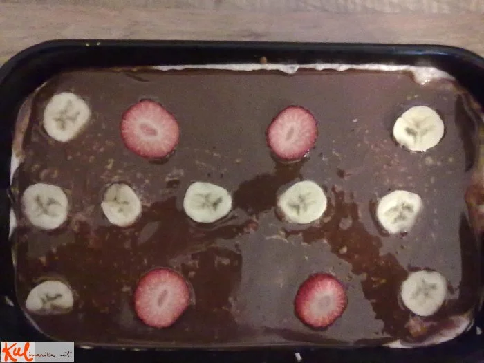 Pecivo ohladimo v hladilniku. Preden ga postrežemo, ga okrasimo s kolobarčki banan in jagod.