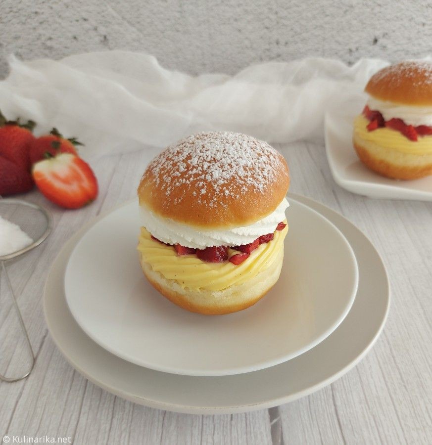 Na spodnjo polovico krofa nabrizgamo vaniljevo kremo.