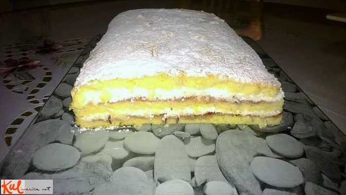 Biskvit pečemo približno 20 minut na 170 stopinj. Pečen biskvit vzdolžno razrežemo na 3 dele (3 plasti).