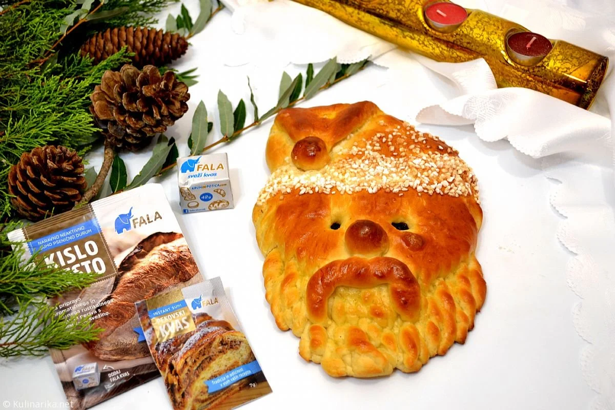 2. Vzhajano testo stresemo na pult, ga pregnetemo in pustimo počivati nekaj minut. Nato testo razvaljamo in izrežemo podaljšane obraze. Naredimo Božiček kapo in njen gornji del obrnemo navzdol. Spodnji del obraza do kape razrežemo s škarjami in nato vsak trak zvijemo, da dobimo kodrasto brado in lase. Iz ostankov testa oblikujemo po dve kroglici za nos in cof na kapi, dodatno oblikujemo še lase, ki gledajo izpod kape, brke in obrvi. Vtisnemo rozine na mesto oči.
