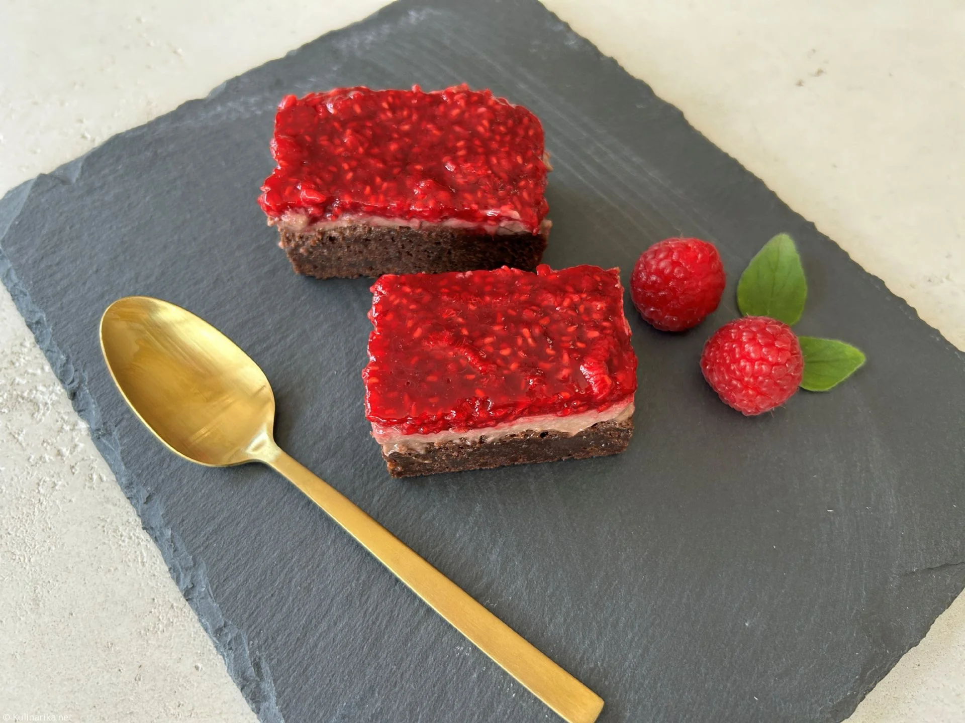 Slastnen čokoladni brownie, kateremu smo za še intenzivnejši okus dodali kremast puding, za piko na i pa malinov preliv, ki vse skupaj popolno zaokroži.