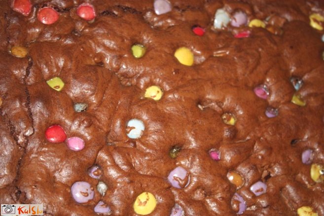 Maslo in čokolado stopimo nad paro. Vmešamo sladkor in vanilin sladkor. Ko se zmes malo ohladi, vmešamo še stepena jajca. V sito damo moko, kakav, pecilni prašek ter presejemo na čokoladno zmes. Dobro zmešamo in dodamo še dodatke. Razporedimo po pomaščenem in pomokanem pekaču. Po vrhu potresemo smartiese in jih malo potlačimo v maso. Pečemo 30 minut na 180 stopinj oz. dokler se zgoraj ne naredi skorjica.