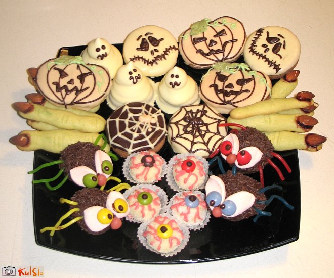 Bonany krvave oči delam iz doma narejenih rafaelo kroglic, receptov zanje je v bazi kar nekaj, jaz se navadno poslužim kar tistega z mlekom v prahu, ker so bolj kompaktne. Na vrk kroglice vtisnem barvast smarties bonbonček (zelen, rdeč.....), okrog tako dobljene "zenice" pa z obarvano belo čokolado narišem rdeče žile. Piškoti, ki so na slikici poleg prstov so narejeni po receptu za linške kekse (polnjeni z marmelado) in po receptu za moto kekse (tudi iz baze, polnjeni z nutello), le da so oblike prilagojene helloween (ker nimam modelčkov za te oblike jih režem s pomočjo doma narejene kartonaste šablone, zamudno ampak ker je 1x na leto ni tako hudo), potem pa preliti z obarvano čokolado (belo čokolado obarvam z barvami za marcipan).