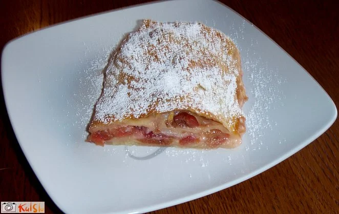 Testo razvaljamo na pomokanem prtu za cca. 70 cm. Ostalo pa razvlečemo z roko čez celo mizo. V kislo smetano zamešamo jajce in na tanko razmažemo po celem testu. Potresemo s češnjami, sladkorjem in piškotnimi drobtinami. Zavijemo s pomočjo prta in položimo v pekač. Pečemo v že ogreti pečici 30 minut na ventilacijski, potem premažemo s stepenim jajcem in pečemo še 20 minut. Vzamemo iz pečice in pokrijemo z alu folijo, da se pecivo umiri in ne izsuši.
