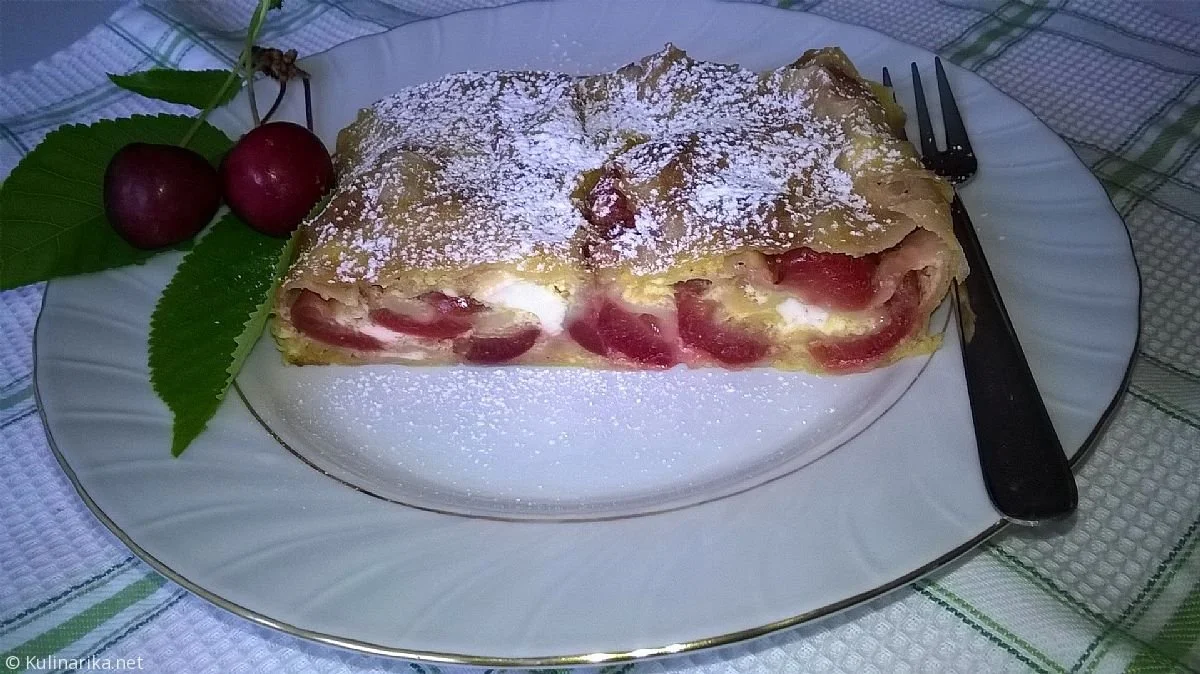 Razvlečeno testo potresemo z na maslu prepraženimi drobtinami, premažemo z nadevom in po vrhu porazdelimo češnje.