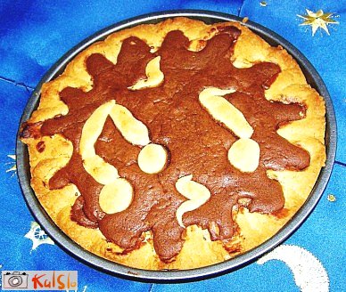 Vzamemo testo iz pečice in nanj razporedimo čokoladno maso. Iz preostalega testa okrasimo še površino, lahko naredimo mrežo ali pa drugačne okraske.