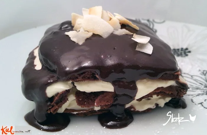 Palačinke: maso za palačinke dobro zmešamo, na koncu dodamo na grobo naribano čokolado. Palačinke pripravimo na kokosovem olju ali maslu. V sredino ponve z žlico vlijemo toliko mase, da nastane krog premera približno 10 cm. Ko se začnejo pojavljati mehurčki, palačinko obrnemo in spečemo še na drugi strani. Ne pečemo pri zelo visoki temperaturi. Palačinke morajo ostati sočne! Če se nam slučajno kakšna ponesreči, nič hudega. Prihranite jo, razrežite na manjše koščke, uporabite skodelo za desert in tam pripravite mešanico kosov palačinke, kreme, vse pa prelijete s stopljeno čokolado in kokosom.