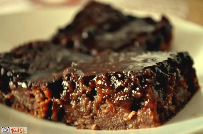 Jajca in sladkor penasto umešamo, nato dodamo še ostale sestavine (pecilni prašek zamešamo v moko). Dobro premešamo in pečemo na 180 stopinj. Biskvit ni potrebno navlažiti, ker je dovolj sočen. Vse sestavine za glazuro damo v džezvo ali kozico in prevremo na manjšem ognju. Ves čas mešamo, da naraste in polijemo po biskvitu.