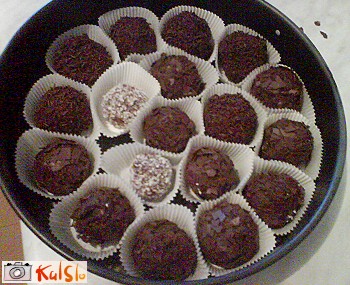 Kekse zmeljemo v prah (lahko kar z valjarjem), dodamo kokos, čokolado v prahu in sladkor, dobro zmešamo. Nato dodamo še rum in spet dobro premešamo, nato zlijemo zraven pripravljen kakav, še topel in zmešamo, da dobimo vlažno maso (da se lepi na roke). Oblikujemo kroglice (velikost po želji). V manjšo posodo damo jedilno čokolado, čokolado v prahu in nekaj mleka in stopimo (najlažje v mikrovalovni na 450 W, 3 minute, ko vzamemo ven zgleda kakor da je preveč mleka, pa ga ni, je treba le dobro premešati vse skupaj, ker je čokolada sicer stopljena, vendar ostane na kupu na sredini posode). V stopljeno čokolado namočimo kroglice in jih povaljamo v kokosu ali mrvicah, kroglice bodo najboljše naslednji dan, še posebej, če jih boste dali čez noč v hladilnik v pokriti posodi.