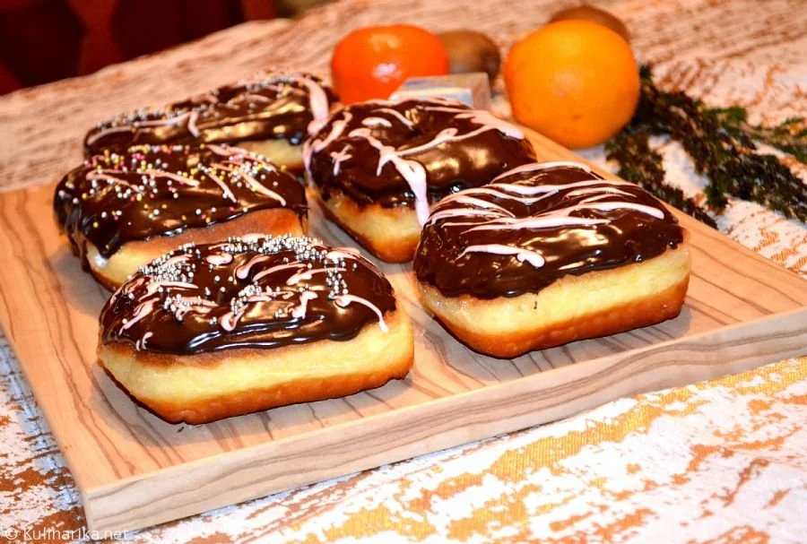 2. Vzhajano testo pregnetemo in ga damo ponovno vzhajati. Ko je testo drugič vzhajalo, ga stresemo na pult, pregnetemo in pustimo nekaj minut počivati. Nato ga razvaljamo, razrežemo na pravokotnike in vse zložimo na pomokano krpo (iz obrezanih delov lahko oblikujemo krofe – dobro pregnetemo, pustimo nekaj minut počivati, nato oblikujemo približno 8 dag težke kroglice). Prekrijemo jih z drugo krpo in pustimo ponovno vzhajati.
