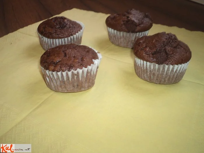 Pekač za muffine obložimo s papirčki za muffine. Napolnimo jih (ne do roba), na koncu lahko po vrhu že vlite mase nadrobimo nekaj malih koščkov čokolade.