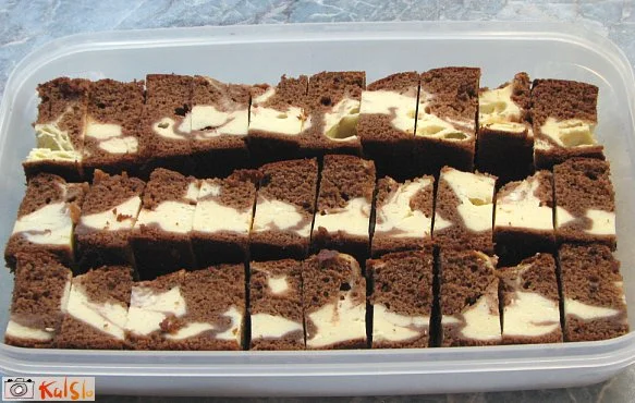 Zamešamo testo in po surovem testu polijemo beli nadev ter ga z vilico malo poglobimo. Vlivamo tako kot bi delali marmorni kolač. Pečemo pol ure na 160 stopinj in pol ure na 200 stopinj. Ohlajenega režemo na kocke.
