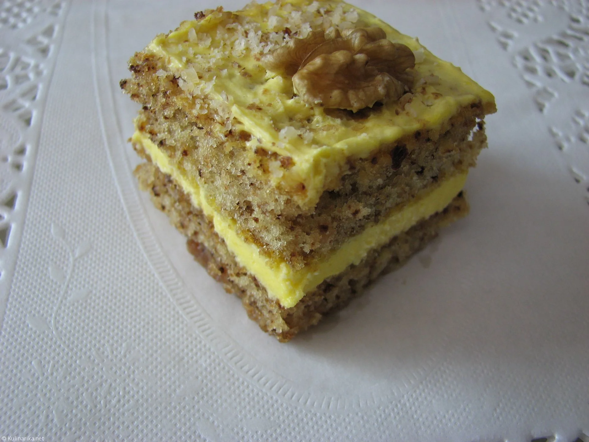 Najprej zmešamo rumenjake, sladkor v prahu in črno kavo, da nastane gladka masa. Nato dodamo mlete orehe in moko pomešano s pecilnim praškom. Zatem naredimo sneg iz petih beljakov in dodamo tej masi. Sedaj vse skupaj počasi zmešamo. Najbolje je s kuhalnico. Maso razgrnemo na namazan in pomokan pekač in pečemo pri 200°C. Pečen biskvit prerežemo na polovico in navlažimo z mešanico ruma in vode. Namažemo s kremo, ki jo pripravimo tako, da tri žlice ostre moke ali gustina razmešamo z nekaj žlicami mleka in počasi vlivamo v vrelo mleko, pri tem vseskozi mešamo, da se masa loči od posode. Sedaj jo ohladimo. Posebej zmešamo 20 dag margarine z 20 dag sladkorja z rumenjakom. Vse to dodamo že ohlajeni kuhani masi in s tem premažemo spodnjo plast peciva, na vrh pa položimo zgornjo plast. Na koncu pecivo prelijemo s čokoladno glazuro.