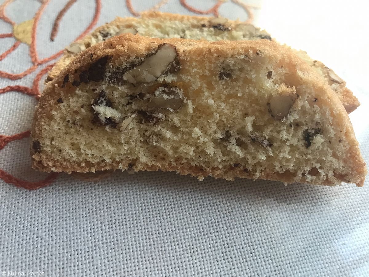 2. Na koncu zmesi na rahlo primešamo narezane orehe, jedilno čokolado in rozine.