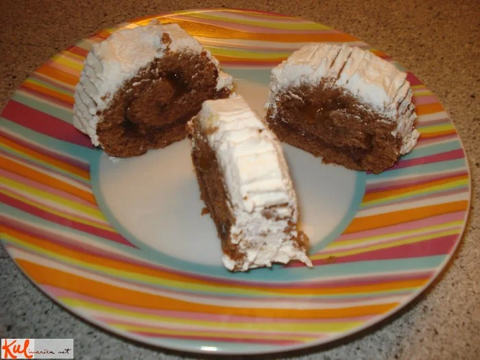 Naredimo trd sneg iz beljakov. Stepemo rumenjake s sladkorjem, dodamo vanilijev sladkor, vodo ali mleko, kapljico olja, premešamo, dodamo kakav in na koncu moko, v katero smo predhodno zamešali pecilni prašek. Premešamo.