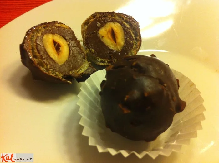 Nutello zmešamo z zdrobljenimi napolitankami. Polovičko kroglice napolnimo z nadevom, dodamo lešnik in pokrijemo z nadevano drugo polovičko.