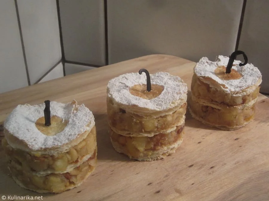 6. Pred postrežbo odstranimo papir, na sredino damo zamašek, potresemo s sladkorjem v prahu in v luknjico damo en košček stroka od vanilije, ki predstavlja jabolčni pecelj.