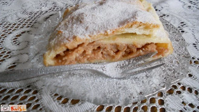 Testo odmrznemo in ga razvaljamo z moko na približno 20 x 40 cm velike dele. Jabolka operemo, očistimo in naribamo na lističe. Dodamo ostale sestavine in premešamo. Tako narejen nadev naložimo na sredino testa in sicer tako, da je na eni strani manj testa kot na drugi. Preostalo testo (kjer ni nadeva) premažemo z margarino. Nato nadev prekrijemo najprej s tistim delom testa, ki ga je manj. Nato ponovimo še z druge strani.