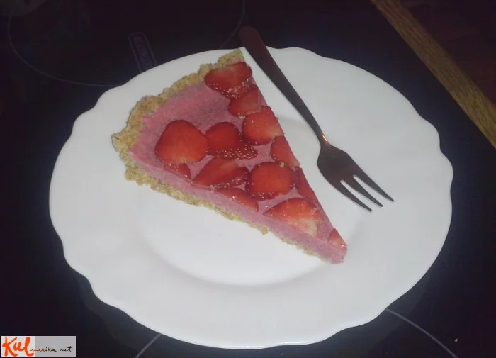 Ko pecivo že damo v pekač, po njem polijemo preliv in vse skupaj položimo v skrinjo, da zmrzne. Nato ga vzamemo ven in obložimo z jagodami, kot je na sliki. Lahko dodamo še kakšno drugo sadje na vrh, da bo več okusov. Ko se pita odtali, jo postrežemo.