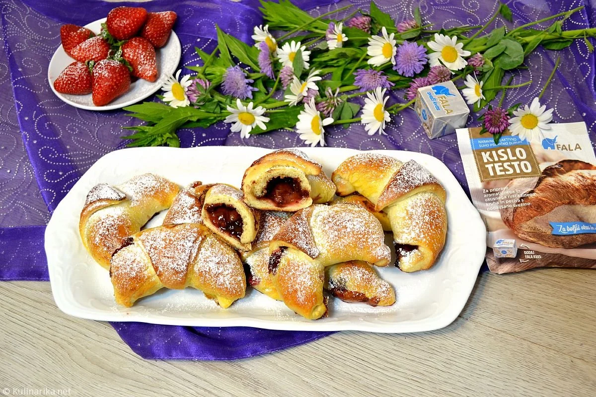 3. Spočito testo razdelimo na šest delov in vsak kos razvaljamo v obliko kroga. Vsak krog razrežemo na osem enakih delov (trikotnikov). Na zunanji del trikotnika položimo žličko Nutelle in razrezane koščke jagod. Z zunanje strani začnemo zvijati trikotnik v rogljiček proti konici trikotnika na sredini kroga. Na koncu zatisnemo vse morebitne odprtinice, ki nastanejo zaradi obilnega nadeva, da bi ta med peko ne stekel ven. Enako oblikujemo vse ostale trikotnike v rogljičke.