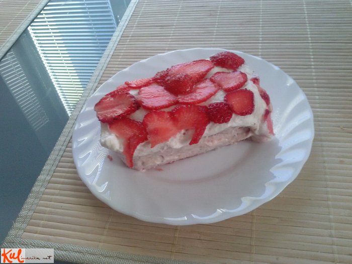 V sok od jagod namakamo piškote. Ena plast piškotov, ena plast kreme... To počnemo, dokler nam ne zmanjka piškotov.