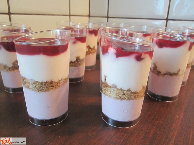 Receptura je zelo fleksibilna, jogurti po svojem okusu, lahko v jogurt dodamo sveže sadje, vloženo sadje, musli, rozine, kokos.. Tudi preliv si naredimo po svojem okusu, če nimamo drugega, tudi žlica ali dve dobre, malo segrete marmelade je super, kakšna borovničeva, pomarančna... Sama imam vložene višnje v sladek Portovec prav za take prilike, ker prijetno zaključi sladico.