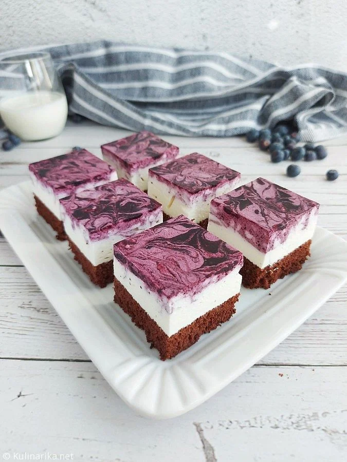 Precejenemu borovničevemu pireju primešamo še namočene in ožete lističe želatine ter ga pustimo, da se na sobni temperaturi ohladi. Pred nadaljevanjem priprave mora biti borovničev pire na otip hladen in še vedno tekoč. V ločeni posodi čvrsto stepemo sladko smetano. Borovničev pire razdelimo na dve dela tako, da odlijemo 80 ml, ki jih bomo uporabili za izdelavo vzorca na vrhu kock. K preostalemu pireju ročno primešamo stepeno sladko smetano.
