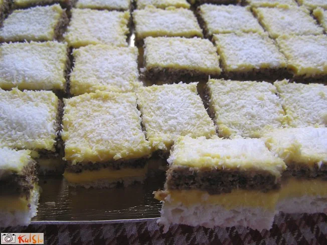 Najprej položimo kokosov biskvit in ga namažemo s kremo, nato položimo orehov biskvit in ga namažemo z ostalo polovico kreme. Na koncu potresemo s kokosovo moko, damo čez noč v hladilnik, da se sestavine prepojijo in režemo na rezine.