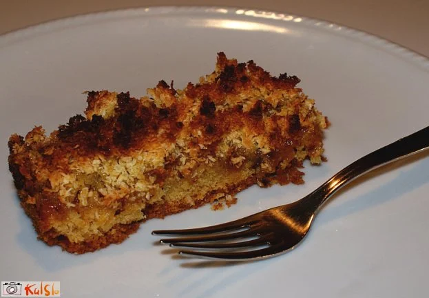 Za testo zmešamo in pregnetemo vse sestavine skupaj. Zmešamo tudi sestavine za preliv. Nato damo testo v namaščen pekač (20x32cm), premažemo z marmelado in polijemo s kokosovim prelivom. Pečemo 50 min 180-200 stopinj.