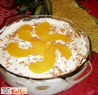 Po vrhu razporedimo breskvo za okras in potresemo s krokantom.