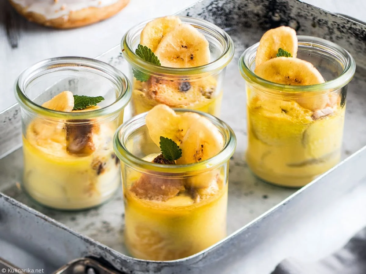 Olupljeno polovico banane narežemo na kolobarje, krofa pa na približno 2 cm velike kocke. Krofa in banano nežno zmešamo ter razdelimo v 4 kozarce. Zmešamo smetano, mleko, sladkor in jajci ter prelijemo preko krofov. Kozarec postavimo v vodno kopel, ki smo jo pripravili v pekaču, in sladico približno 30–40 minut v vodni kopeli indirektno pečemo na pokritem žaru. Ko je pečena, jo okrasimo z bananinim čipsom.