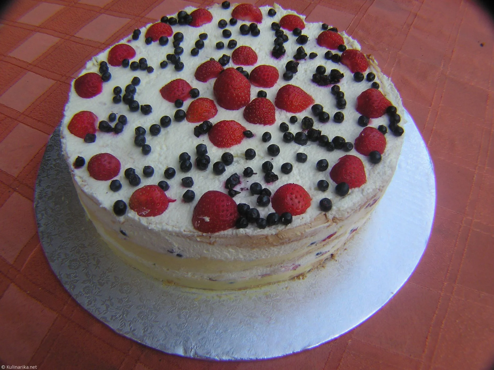 3. Pečeno testo razrežemo na tri dele ter prvo plast testa premažemo s kremo, nanj zložimo sadje in premažemo s stepeno smetano. Ponovimo dva do trikrat. Pecivo postavimo čez noč v hladilnik in naslednji dan uživamo.