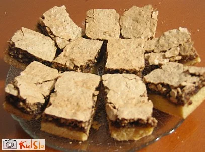 Iz beljakov stepemo trd sneg. Primešamo sladkor, vanilijev in rumov sladkor ter mlete lešnike s čokolado v prahu. Dobro zmešamo in namažemo na testo z marmelado. Pečemo pri 175 stopinjah 35 minut. Malo ohladimo in narežemo na kockice. Potresemo s čokolado v prahu.