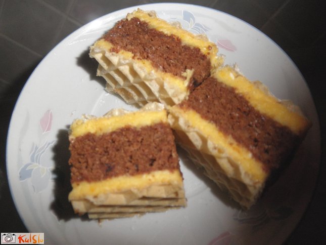 Namažemo oblat s polovico kreme, nato damo pečen biskvit, zopet namažemo s preostalo kremo in spet oblat. Dobro je, da namazano en dan počiva.